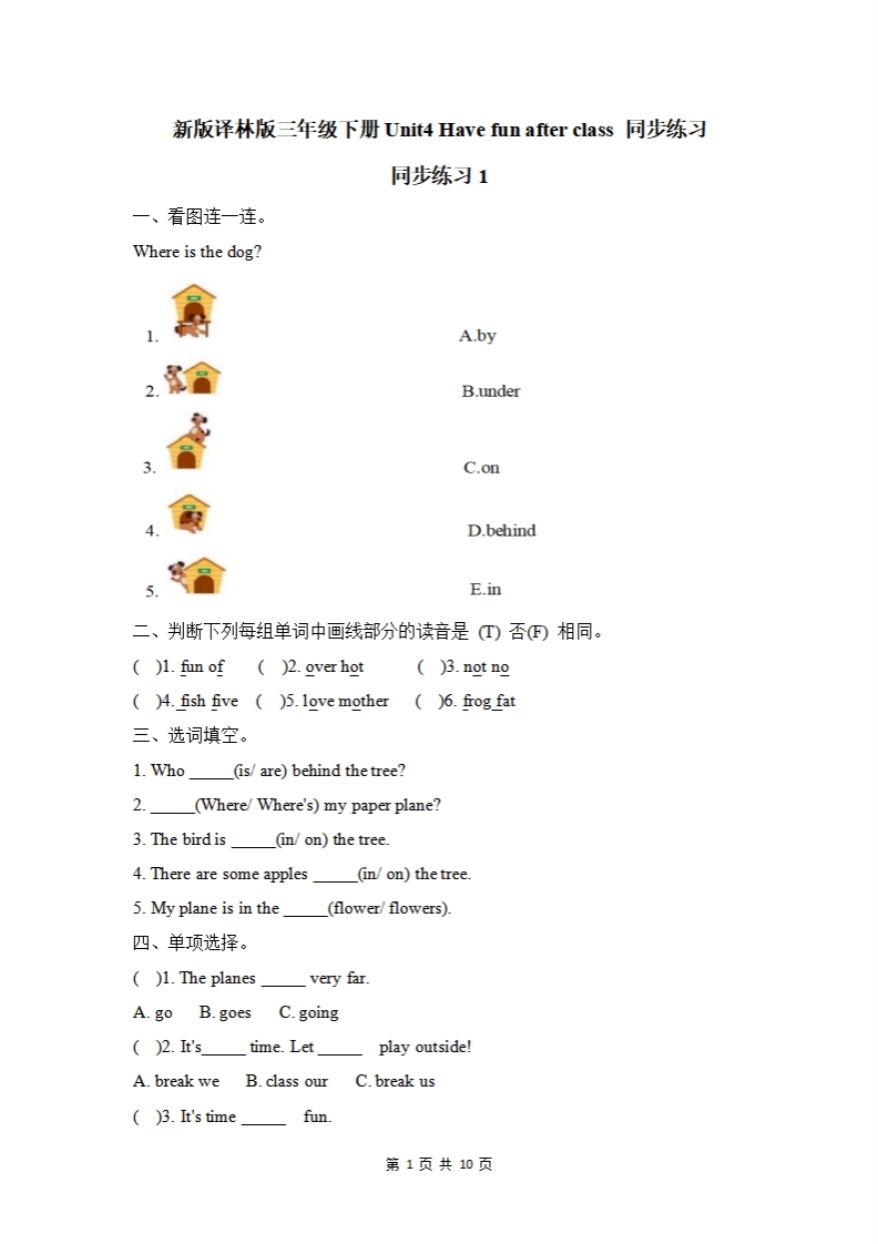 首页三年级英语下册【译林版】三下英语 Unit4 同步练习