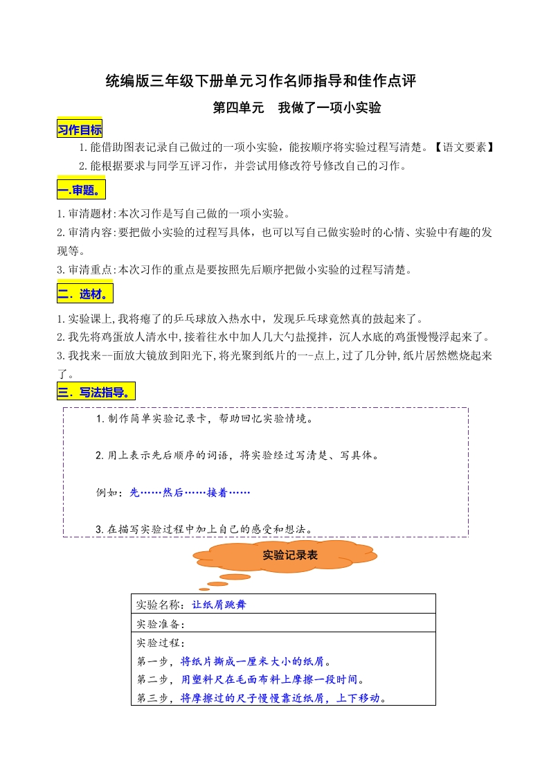 部编版三年级下册第3单元《我做了一项小实验》写作指导+范文赏析+名师指导