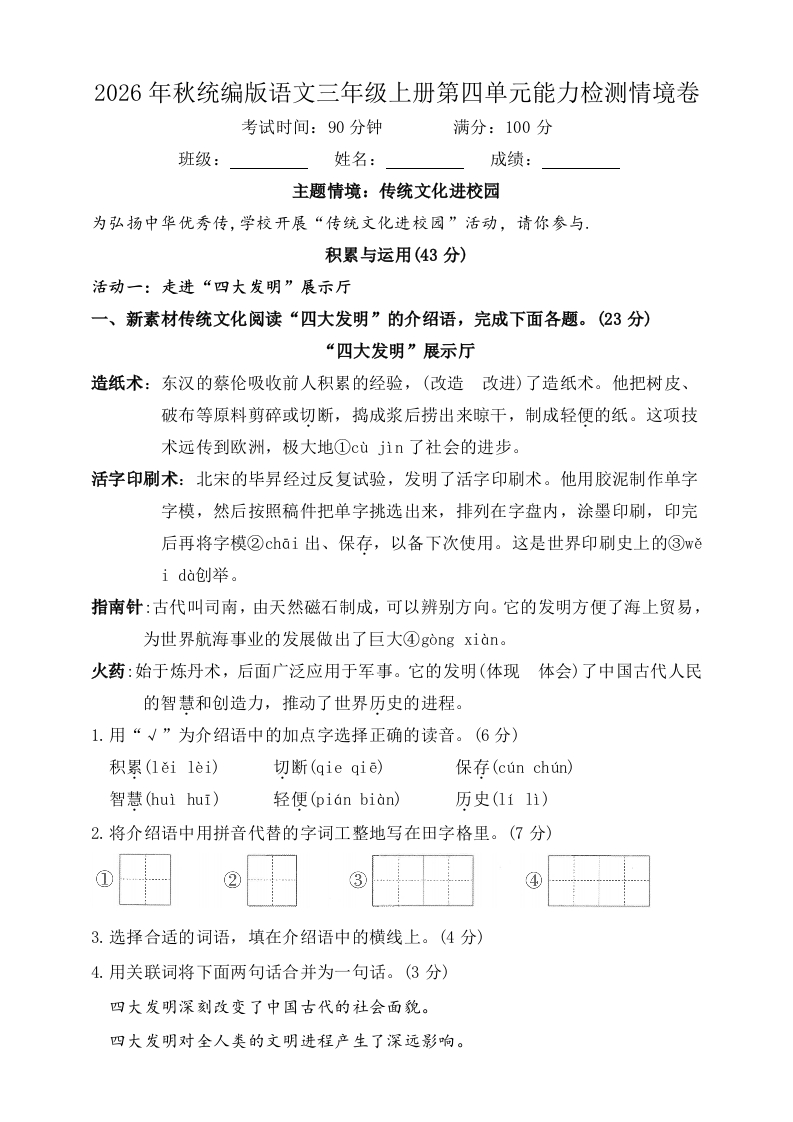 第四单元综合能力检测情境卷(含答案)2026年春统编版语文三级下册