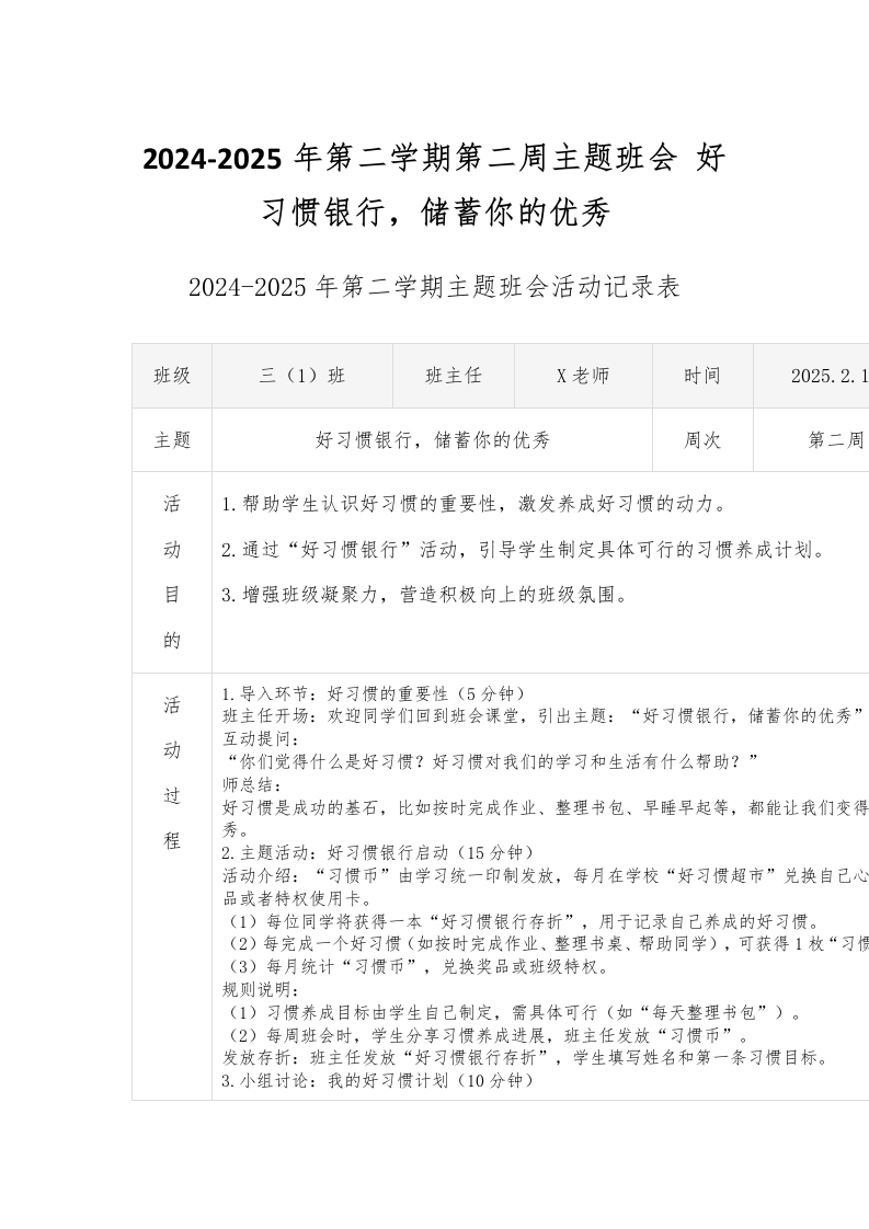 2024-2025年第二学期第二周主题班会好习惯银行,储蓄你的优秀