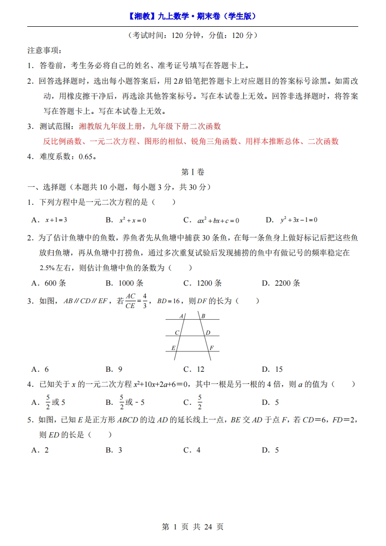 【湘教】9上数学期末卷【9上+二次函数】