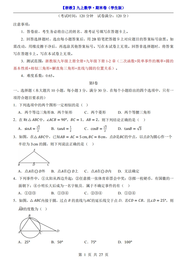 【浙教】9上数学期末卷【9上全册+9下1-2章】