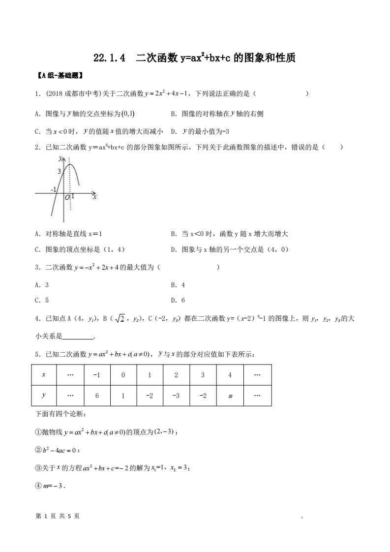 首页九年级数学上册九年级(上)数学 二次函数y=ax^2+bx+c的图象和性质分层作业(人教版)