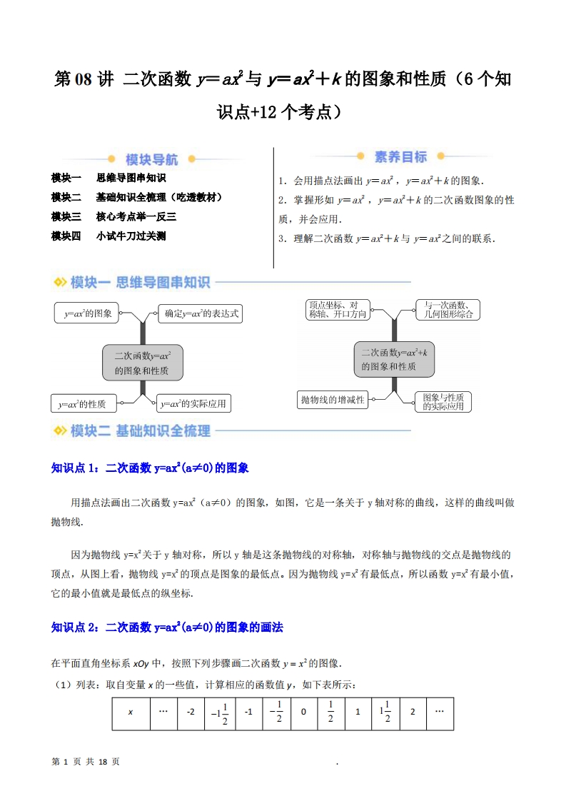 九年级(上)数学 二次函数y=ax2与 y=ax2+k的图象和性质暑假自学课(人教版)