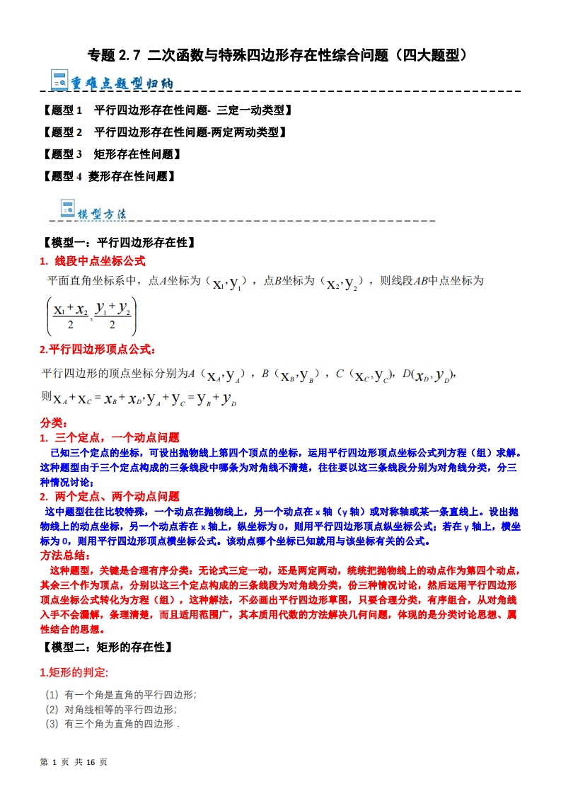 九年级(上)数学 二次函数与特殊四边形存在性综合问题(人教版)