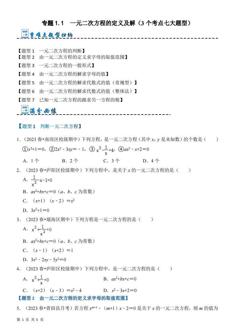 九年级(上)数学 一元二次方程的定义及解(人教版)