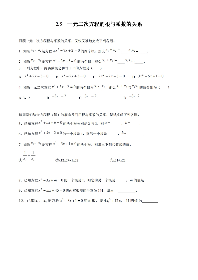 首页九年级数学上册九年级(上)数学 一元二次方程的根与系数的关系2(北师大版)