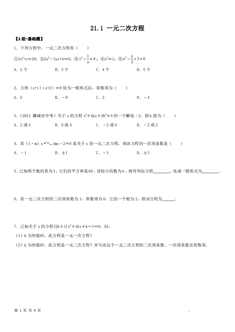 首页九年级数学上册九年级(上)数学 一元二次方程分层作业(人教版)