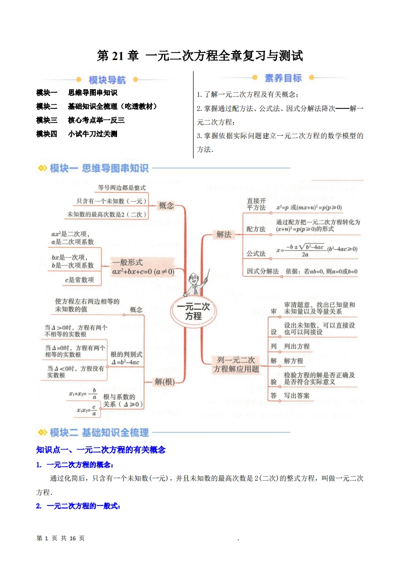 九年级(上)数学 一元二次方程全章复习与测试暑假自学课(人教版)