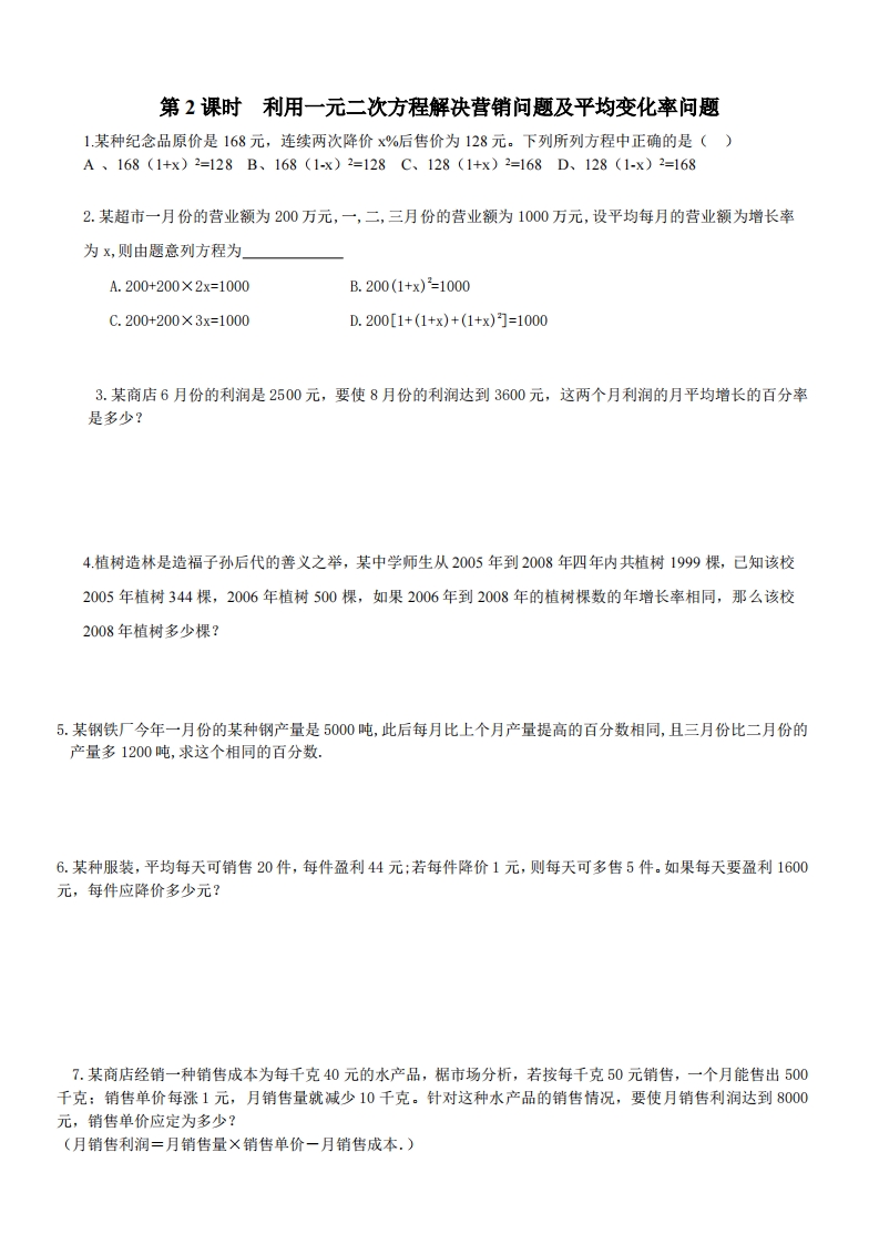 九年级(上)数学 第2课时 利用一元二次方程解决营销问题及平均变化率问(北师大版)