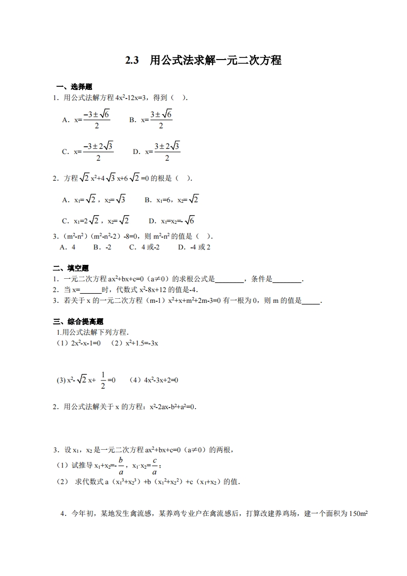 九年级(上)数学 用公式法求解一元二次方程 同步练习(北师大版)