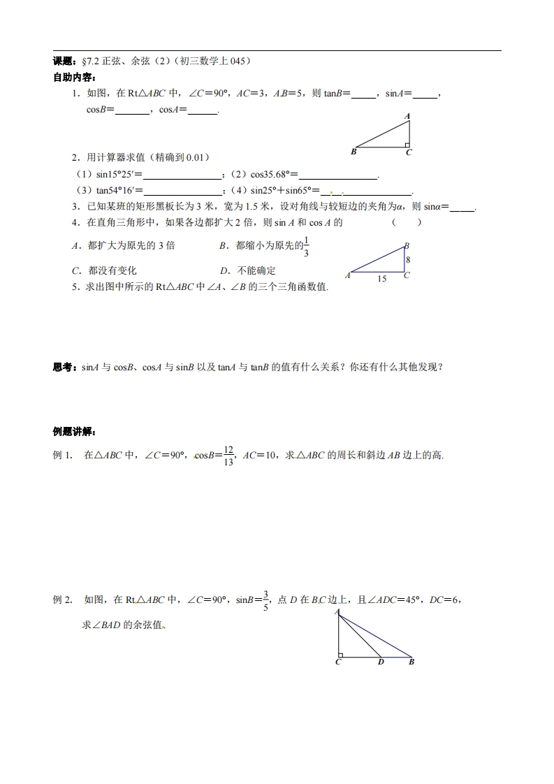九年级(上)数学 正弦、余弦(2)(苏科版)