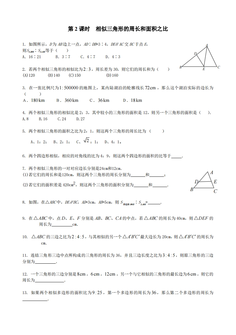 九年级(上)数学 第2课时 相似三角形的周长和面积之比1(北师大版)