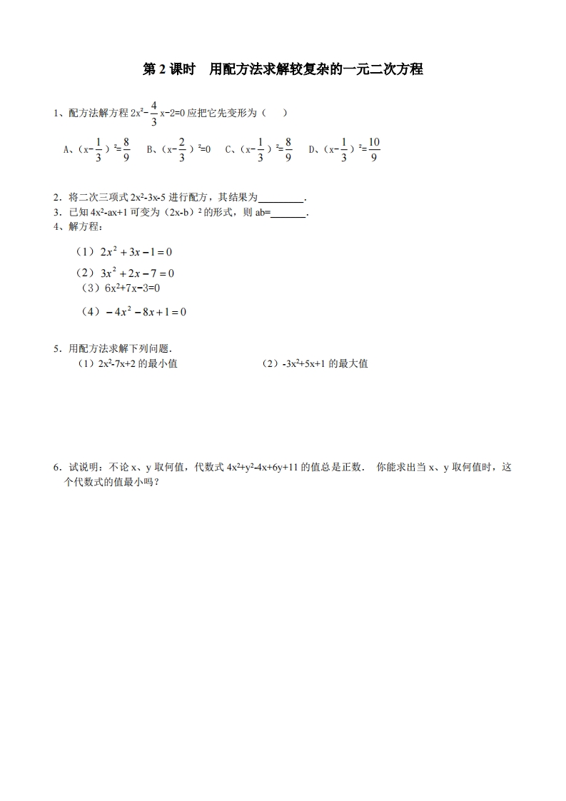九年级(上)数学 第2课时 用配方法求解较复杂的一元二次方程2(北师大版)