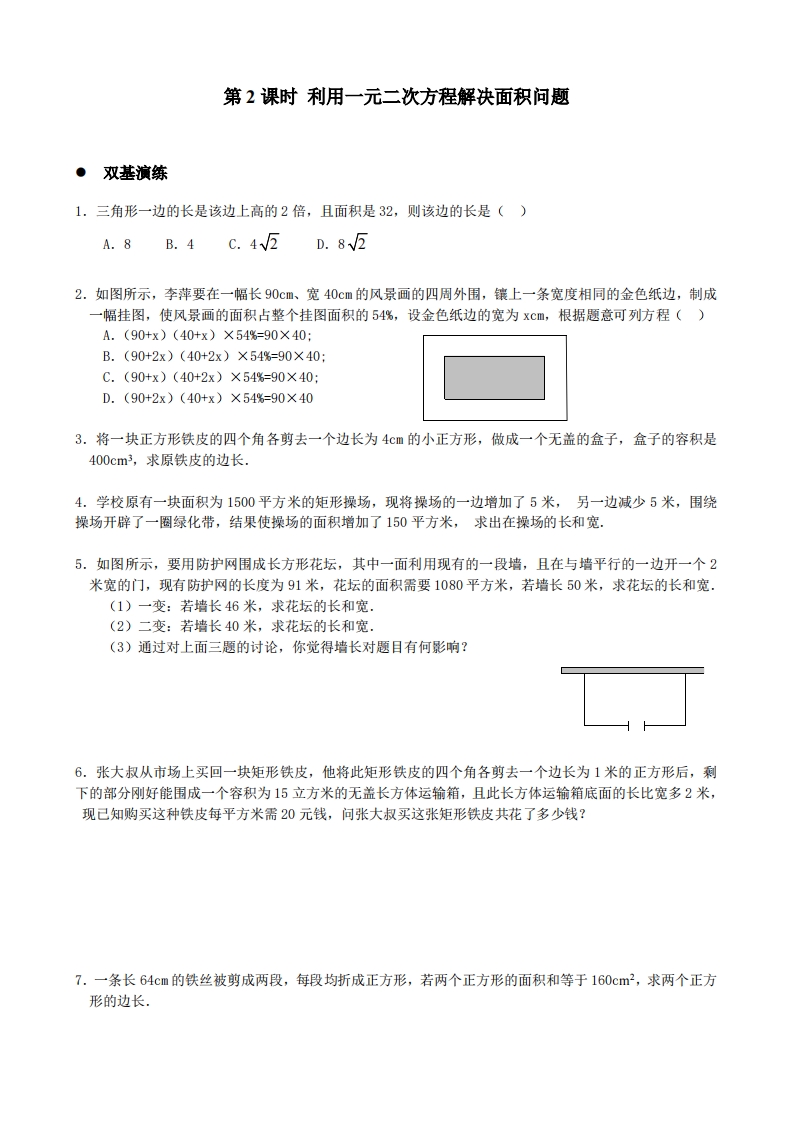 九年级(上)数学 第2课时 利用一元二次方程解决面积问题1(北师大版)