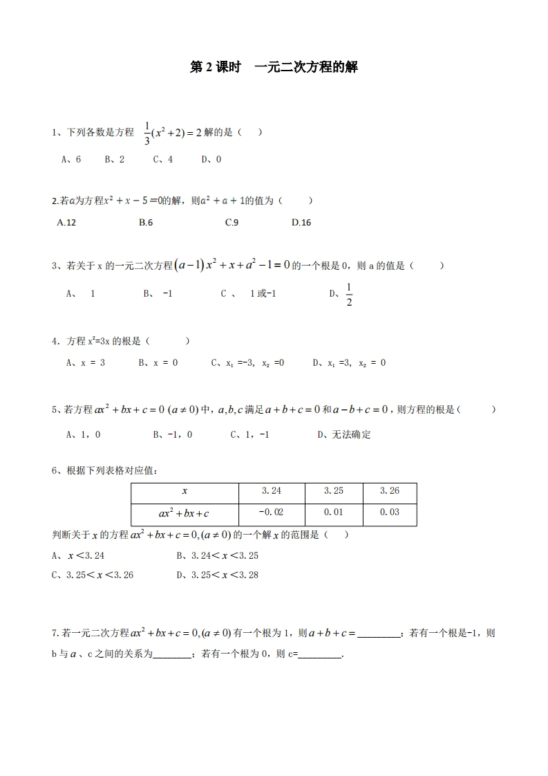 九年级(上)数学 第2课时 一元二次方程的解(北师大版)