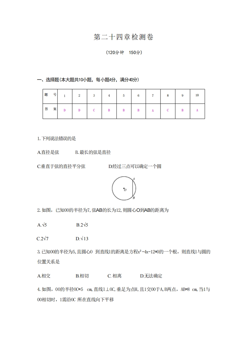 九年级(上)数学 第二十四章《圆》单元检测卷(有答案)(人教版)