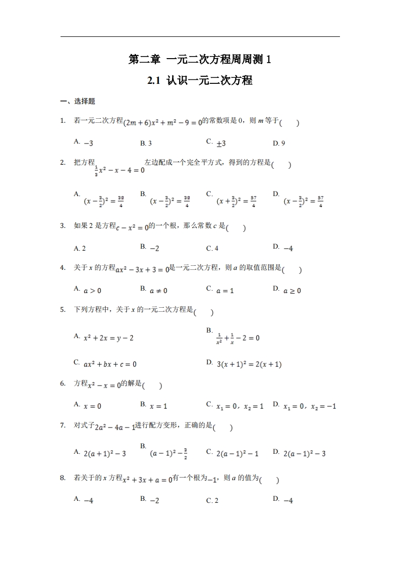 九年级(上)数学 第二章 一元二次方程周周测1(2
