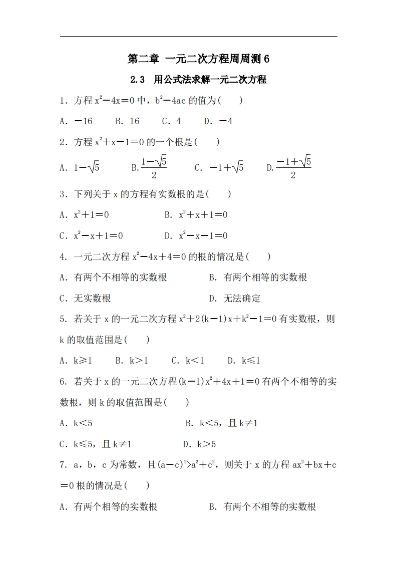 九年级(上)数学 第二章 一元二次方程周周测6(2