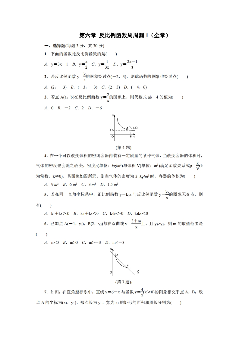 九年级(上)数学 第六章 反比例函数周周测1(全章)(北师大版)