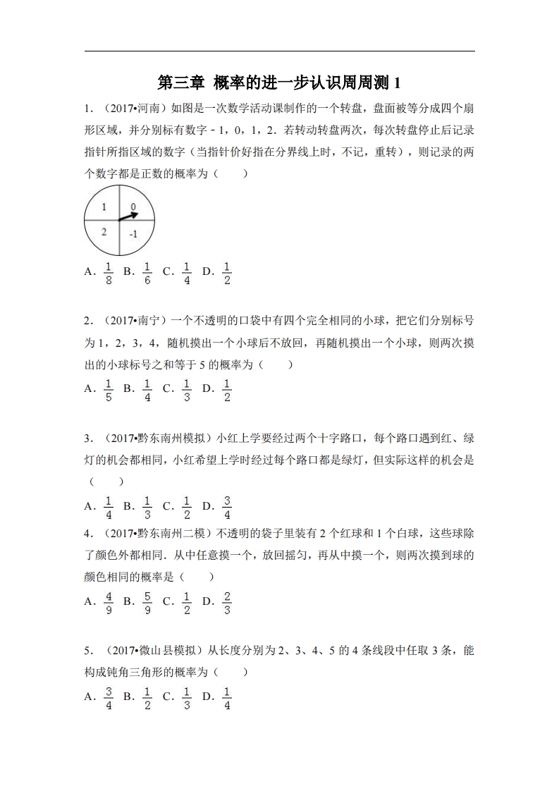 首页九年级数学上册九年级(上)数学 第三章 概率的进一步认识周周测1(3
