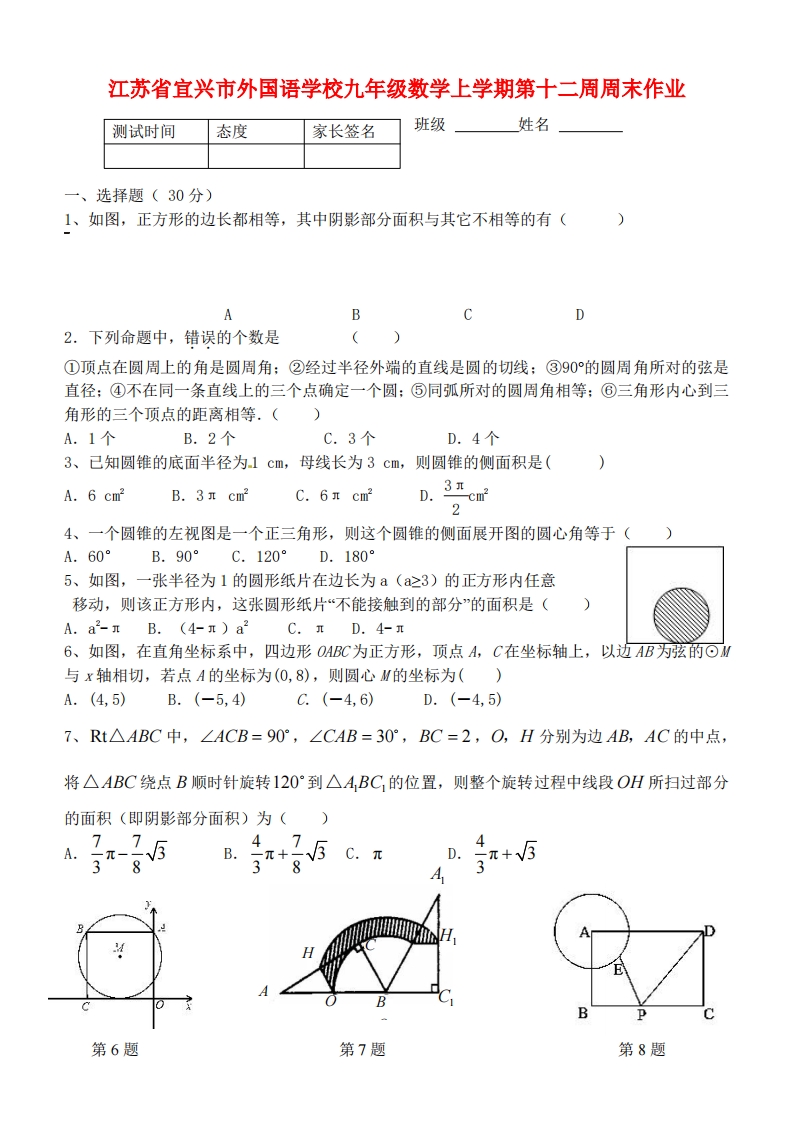 首页九年级数学上册九年级(上)数学 第十二周周末作业 (苏科版)