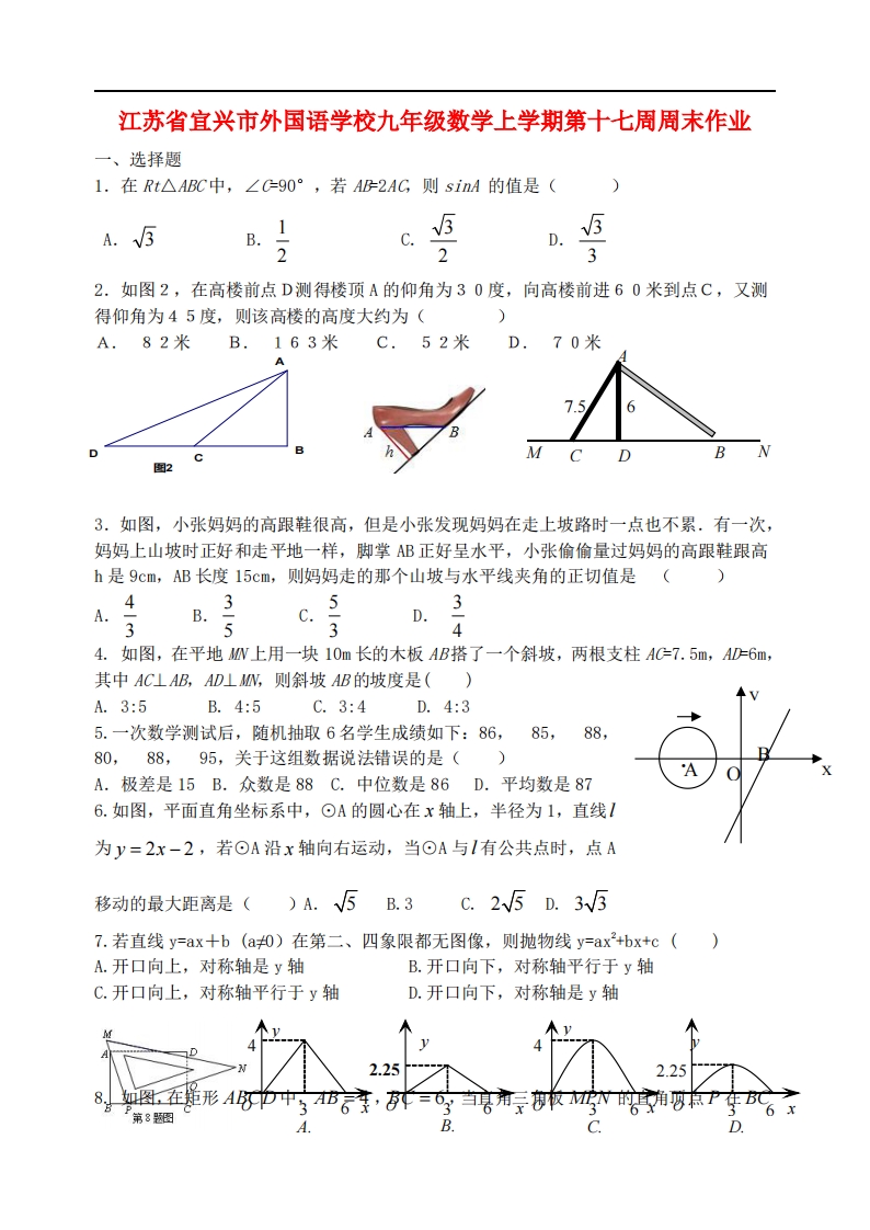 九年级(上)数学 第十七周周末作业 (苏科版)