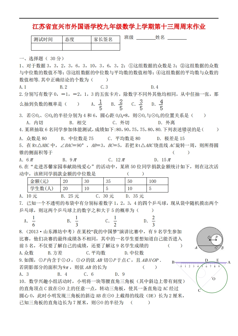 九年级(上)数学 第十三周周末作业 (苏科版)