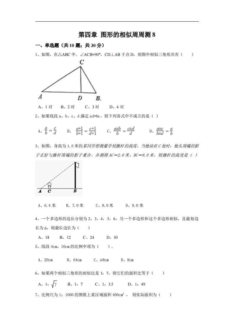 首页九年级数学上册九年级(上)数学 第四章 图形的相似周周测8(全章)(北师大版)