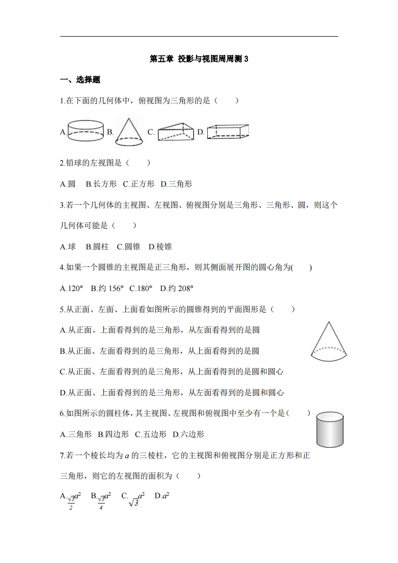九年级(上)数学 第五章 投影与视图周周测3(5