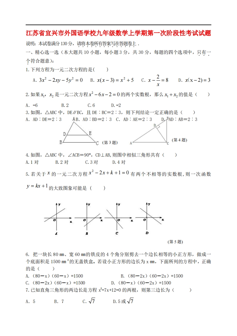 九年级(上)数学 第一次阶段性考试试题 (苏科版)