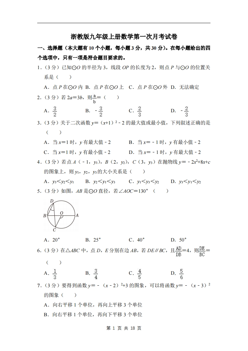 首页九年级数学上册九年级(上)数学 第一次月考试卷 3(浙教版)