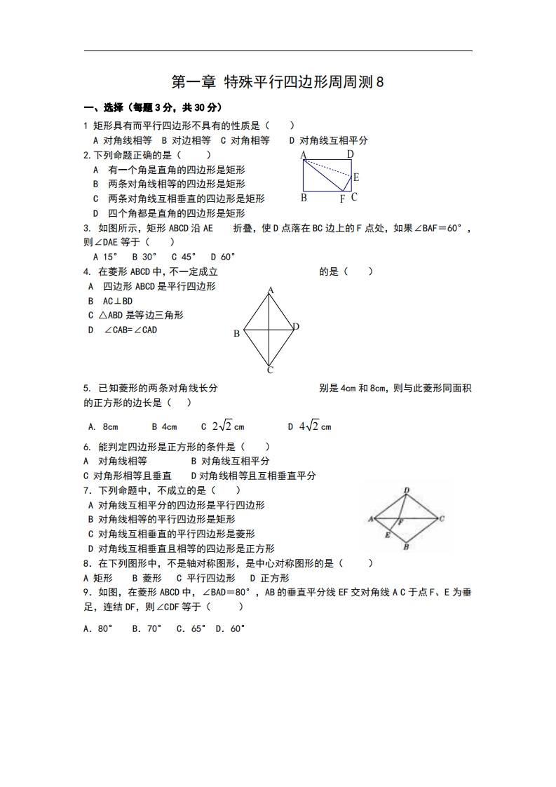 九年级(上)数学 第一章 特殊平行四边形周周测8(全章)(北师大版)