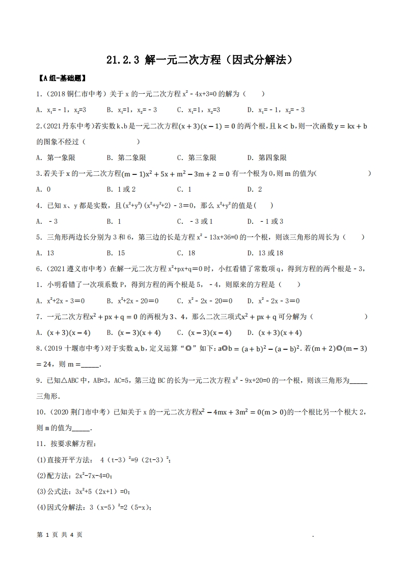 首页九年级数学上册九年级(上)数学 解一元二次方程(因式分解法)分层作业(人教版)