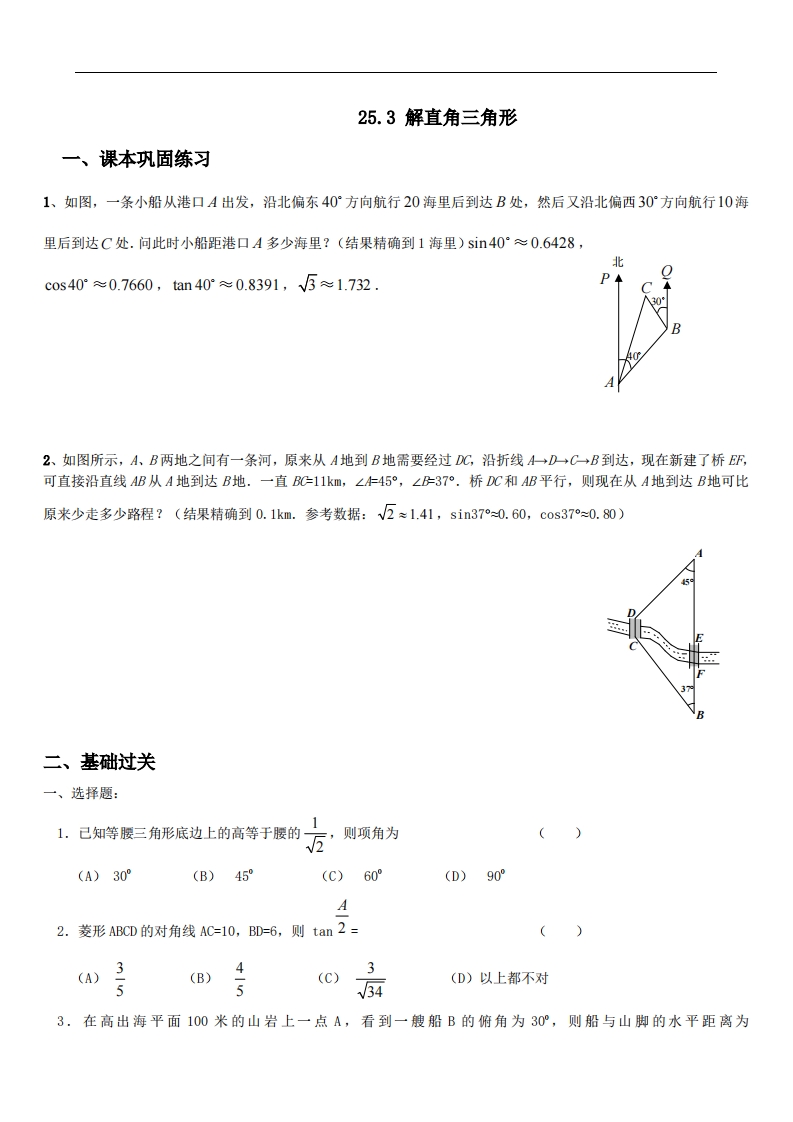 首页九年级数学上册九年级(上)数学 解直角三角形同步练习(沪教版)