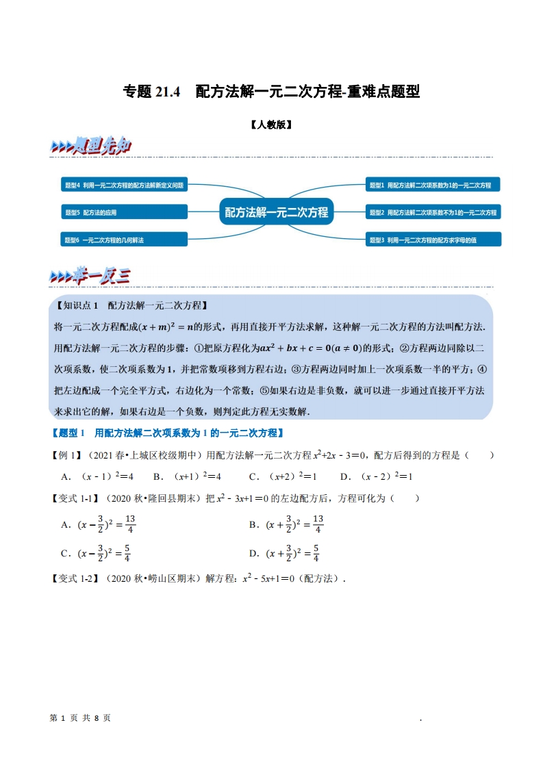 首页九年级数学上册九年级(上)数学 配方法解一元二次方程重难点题型(人教版)