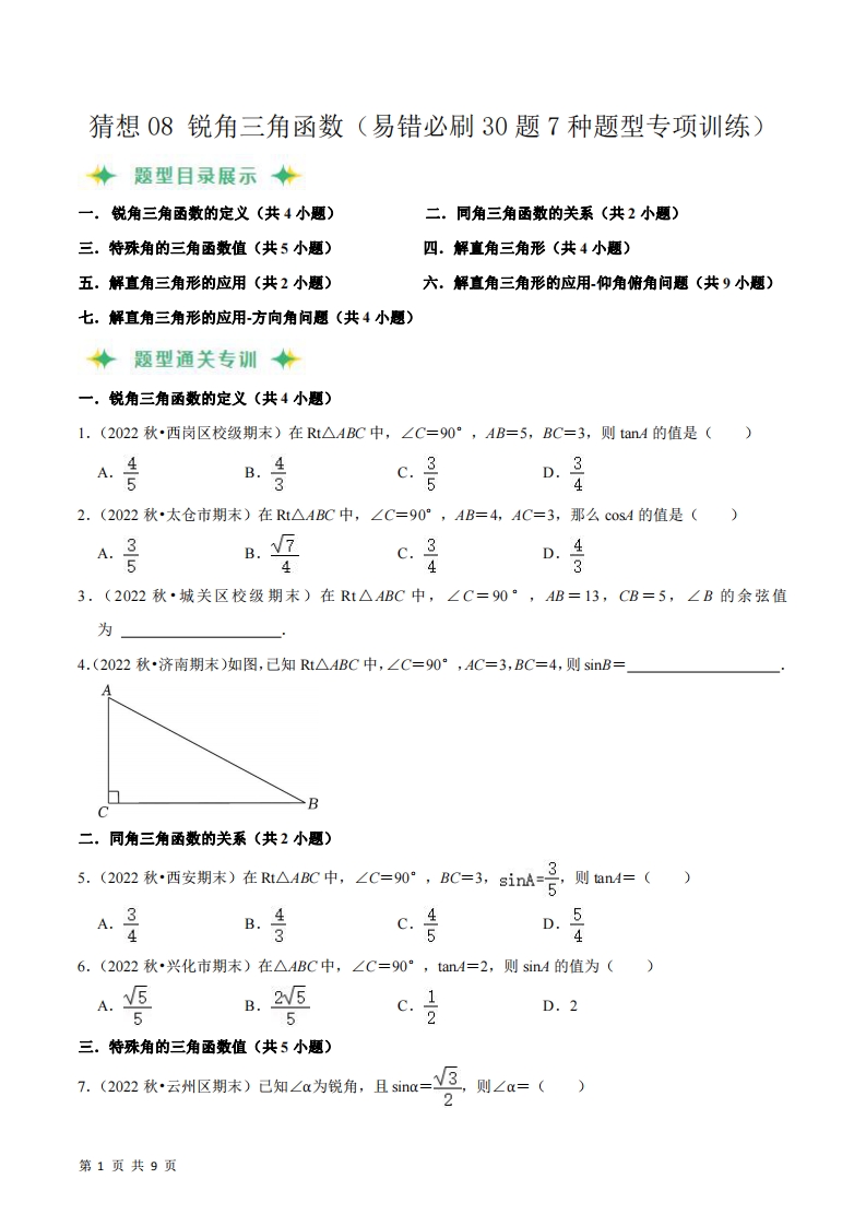 九年级(上)数学 锐角三角函数考题猜想(人教版)