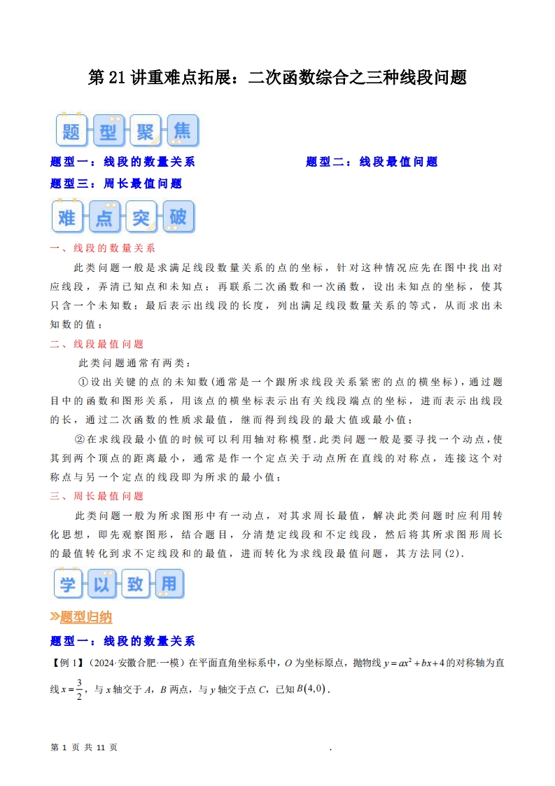 九年级(上)数学 重难点拓展:二次函数综合之三种线段问题暑假自学课(人教版)