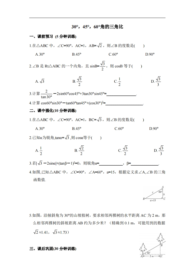 九年级(上)数学《30°,45°,60°角的三角比》分层练习1(青岛版)
