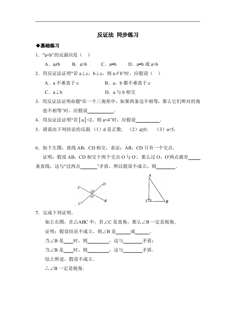 九年级(上)数学《反证法》同步练习1(青岛版)