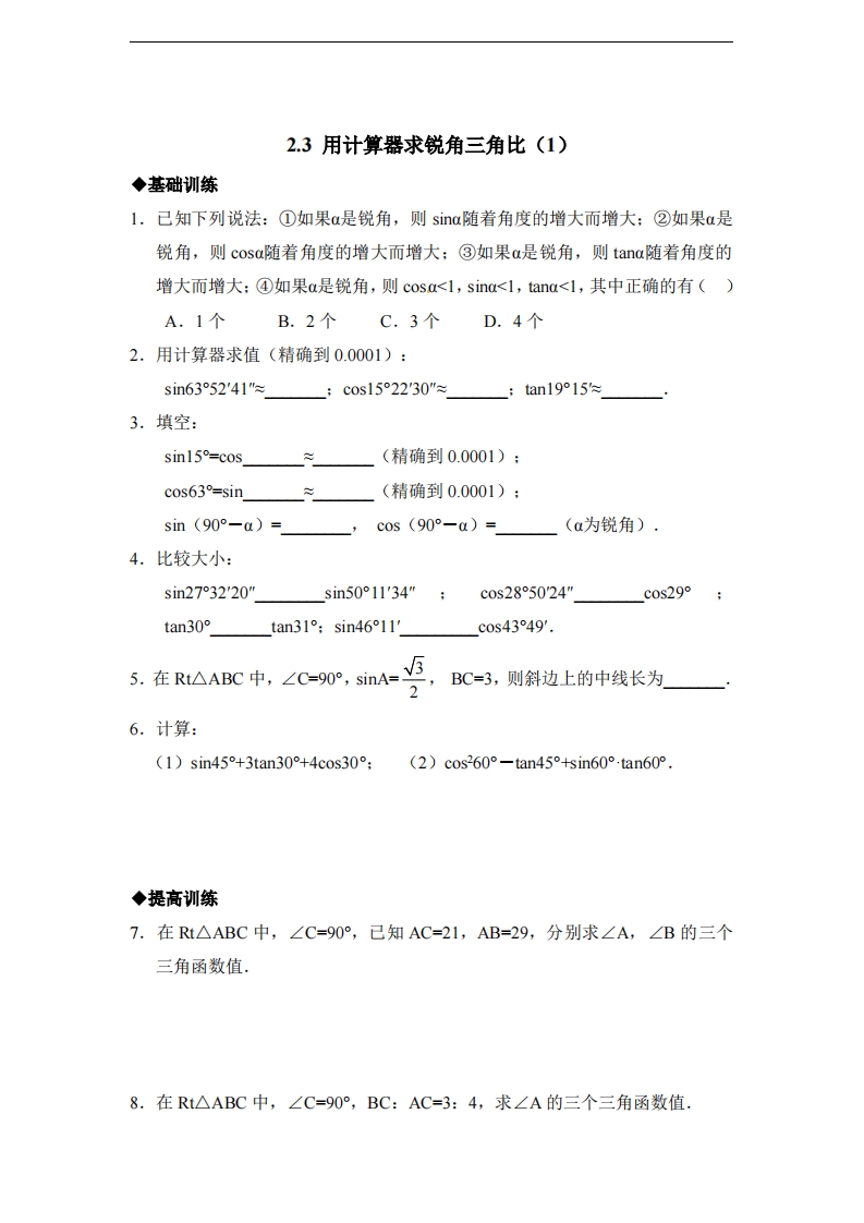 九年级(上)数学《用计算器求锐角三角比》分层练习1(青岛版)