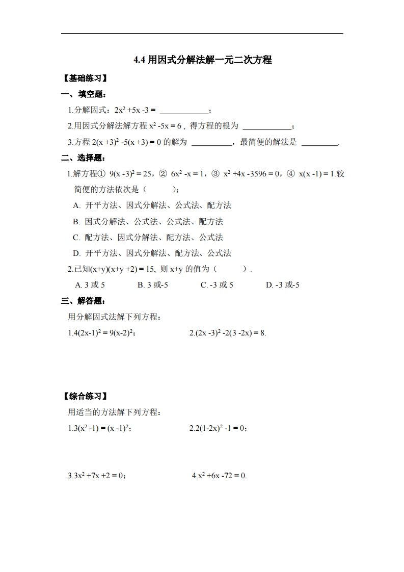 九年级(上)数学《用因式分解法解一元二次方程》同步练习2(青岛版)
