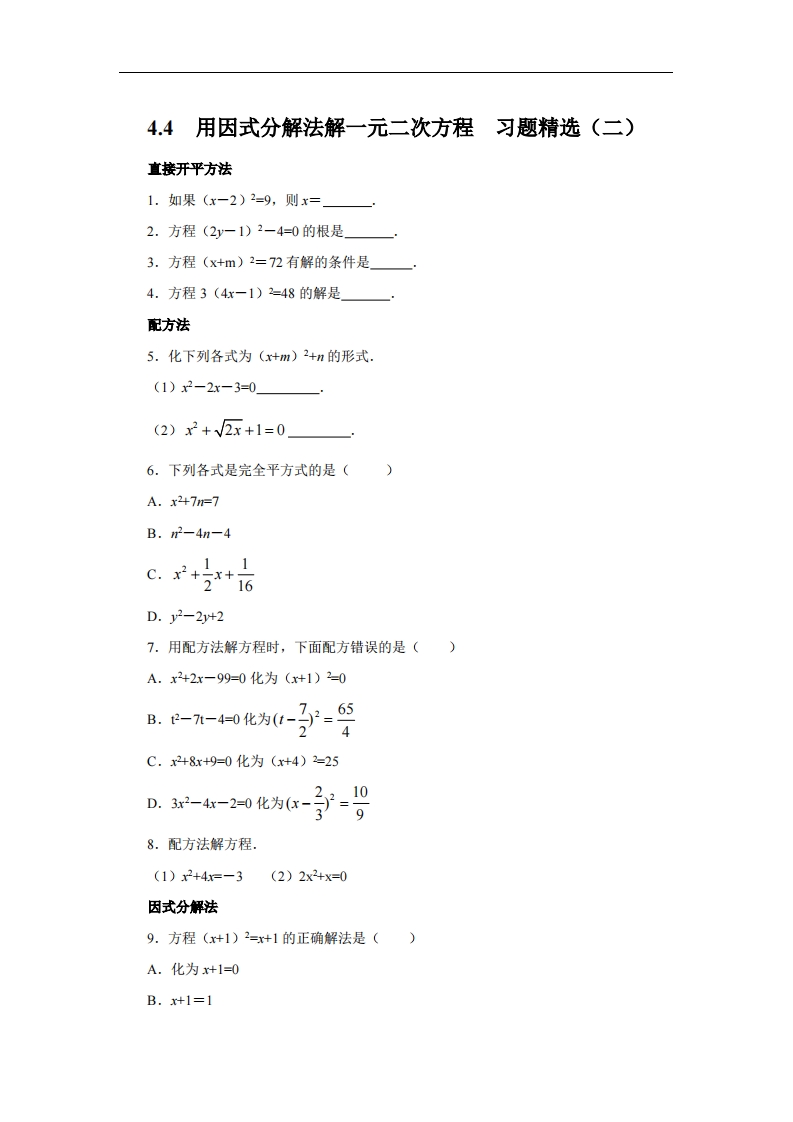 九年级(上)数学《用因式分解法解一元二次方程》习题精选(二)(青岛版)