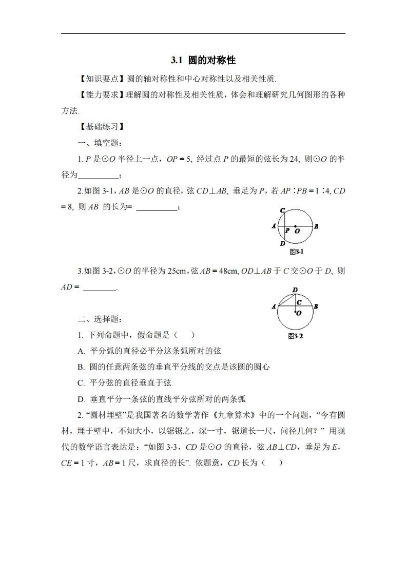 九年级(上)数学《圆的对称性》基础练习1(青岛版)