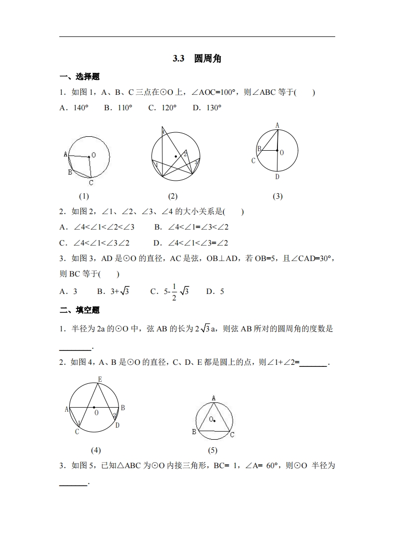 九年级(上)数学《圆周角》同步练习1(青岛版)