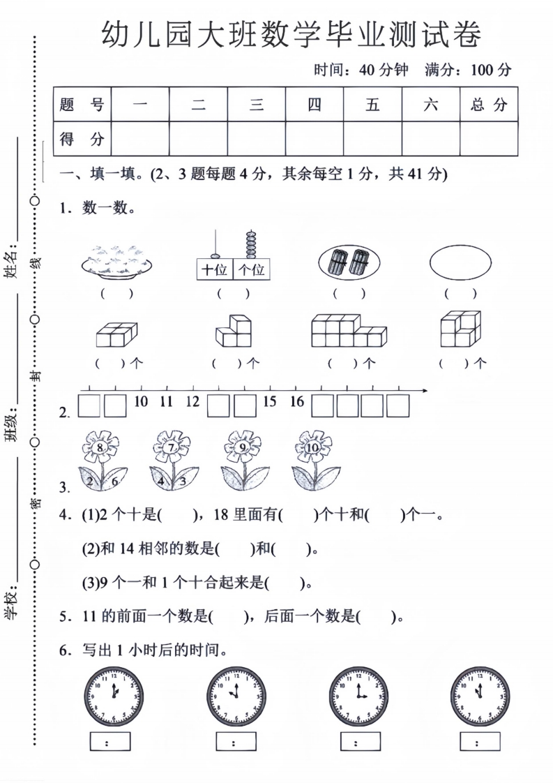 首页幼小衔接数学试卷幼儿园大班数学毕业测试卷5
