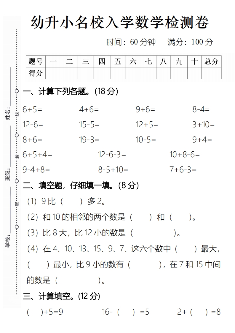 首页幼小衔接数学试卷幼升小名校入学数学检测卷 2