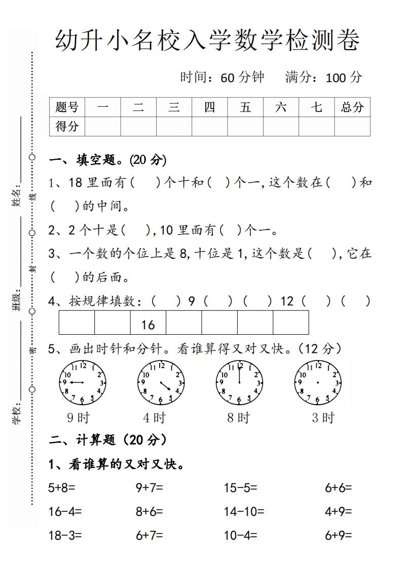 首页幼小衔接数学试卷幼升小名校入学数学检测卷1-2