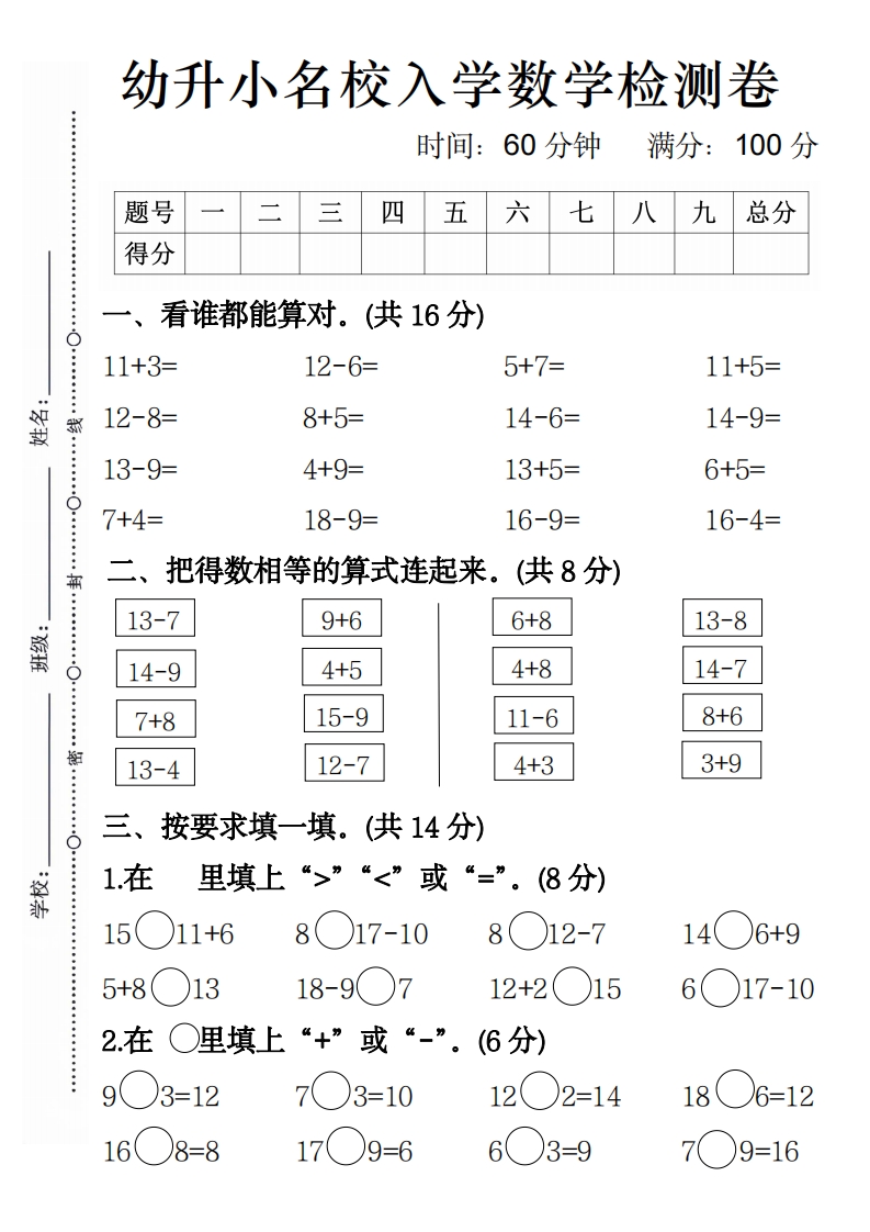 首页幼小衔接数学试卷幼升小名校入学数学检测卷4