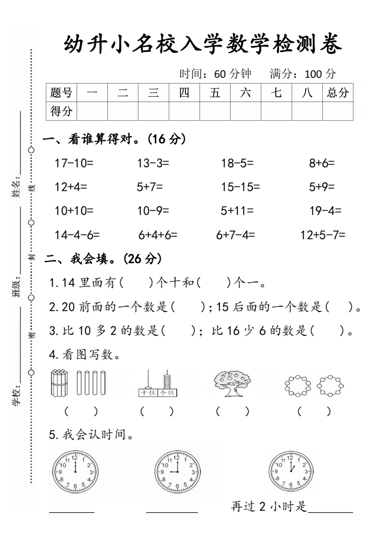 首页幼小衔接数学试卷幼升小名校入学数学检测卷5-1